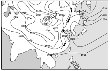 2、综合题 下图为2013年11月24日8时亚洲部分地区海平面气压分布图(单位:百帕),下表为北京24日~25日天气数据变化情况。阅读图表回答下列问题。(7分)