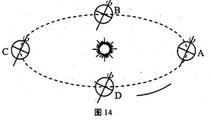 2、综合题  图14为北半球二分二至地球位置示意图,读图回答下列问题。(8分)
