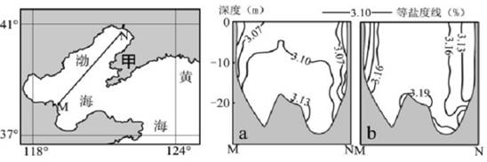 2、综合题 下右图示意左图中MN断面冬、夏季的海水盐度分布,读图回答下列问题。