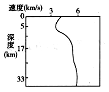 本题解析:根据图示地震波大约在5KM处,波速开始明显加快,故判断该处莫霍界面应位于5KM位置处。