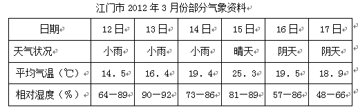 5、单选题 “回南天”天气返潮现象,一般出现在我国华南地区每年的二、三月份,主要是因为冷空气走后,暖湿气流迅速反攻,致使气温回升,空气湿度加大,一些冰冷的物体表面遇到暖湿气流后,容易产生水珠。下表为“江门市2012年3月份部分天气数据”,据此回答下列各题。