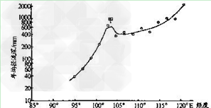 2、单选题 下图为中国部分区域多年平均径流深【径流深R,指计算时段内的径流总量平铺在水文测站以上流域面积上所得的水层厚度,它的常用单位为毫米(mm)。若时段为△t(s),平均流量为Q(m3/s ),流域面积为A(km2),则径流深R (mm)由下式计算:R=Q△t/(1000A)。平均径流深则为径流深的多年平均值】1随经度的变化示意图,图中选取的是沿台湾- 江西- 四川- 青海等省一线水文观测站(图中小圆点)以上流域面积的数据。回答1-3题