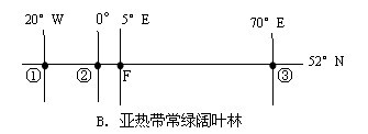 2.结合经纬度位置,②位于西欧温带海洋性气候,故自然植被为温带落叶阔叶林;