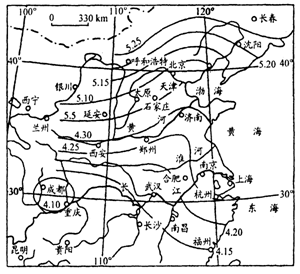3、单选题  某一地区同时出现某一物候现象的各点的连线简称为等物候线。读我国东部刺槐年平均始花期图(图中数字代表月、日)。回答问题。