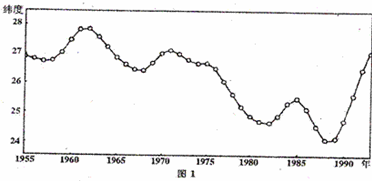 2、单选题 西太平洋副热带高压脊线位置的年际变化与东部地区降水的变化密切相关,我国锋面带的位置大约在副热带高压脊线以北约5°C~8°C图1为近几十年来7~8月西太洋副热带高压脊线所在纬度位置波动示意图,读图回答1—2题。