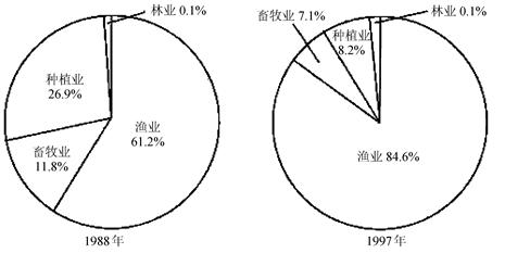 小题1:.由图可以看出:石狮从1988年-1997年,渔业比重上升幅度大,种植业和蓄牧业缩小,林业比重始终不大。由于防护林少,渔业比重大,又位于沿海,易受台风影响,损失严重,A正确;林业比重不大,但产值一定上升,B错;过度发展养渔业,会影响海洋生态环境,C错;渔业的发展是受市场影响而扩大的,不会出现严重供过于求,D错。