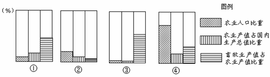 D.④国农业人口比重大,生产技术先进,农产品商品率高