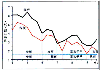 1、单选题 读“古代与现代长沙地区4~9月平均降水日数对比图”(下图),以下说法正确的是