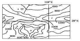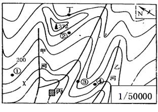本题解析:图中1厘米代表实际距离为0.5千米;根据图中给出的数值“200”、“372”可知,等高距为50米,结合等高线和河流的关系可判断出X地海拔高度为100米;丙村海拔高度为50米,山顶海拔高度为372米,因此两地相对高度为322米;根据图中的指向标可知,丁村位于丙村的东北方向。