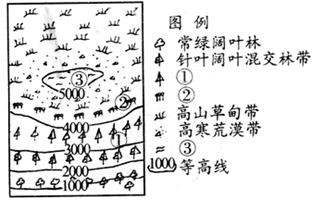 小题1:图示①②依次位于高山针阔叶混交林之上,故依次为高山针叶林、高山灌木;③位于高寒荒漠带之上,为积雪冰川带,故选A项。