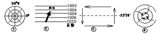 4、单选题 下面①②③④四幅分别表示地球自转、风向、洋流、气旋的示意图中属于南半球的是