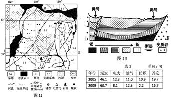 1、综合题 图12为我国某区域示意图,图13为12中Ⅰ~ Ⅱ两点连线的地质剖面示意图,表3为乙市工业产值构成表。完成下列问题。(14分)