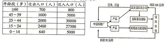 3、单选题 表为2002~2007年我国某特大城市郊区平均人口迁移统计资料,迁入人口以初中学历的外来人口为主。如图为该市某鞋厂同一款旅游鞋产销流程示意图。完成7~8题。