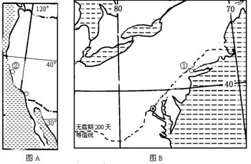 (1)结合图示的海陆位置和经纬度位置,两幅图分别表示美国西岸和东北部地区,通过题中有关金融方面的叙述可知①城市是纽约,美国东西海岸分别有墨西哥湾暖流和加利福尼亚寒流,在海上航行时,受洋流的影响,航速有明显的不同。因加利福尼亚寒流的流向是自北向南,墨西哥湾暖流的流向是自南向北,所以从①到②的过程中,是逆流航行,回程是顺流航行。