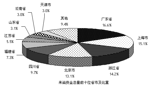 (3)东部来渝资金数量多,东部地区成为重庆资金的主要来源地。东部地区来渝资金最多的是广东省、上海市和浙江省。西部地区来渝资金居前两位的是四川和云南。(2分)