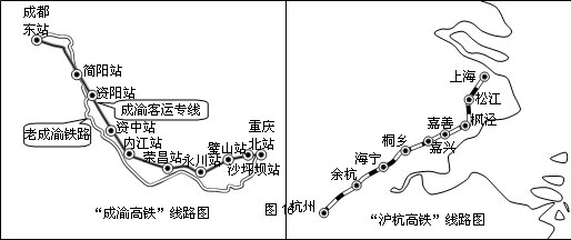 材料二?继老成渝铁路、成遂渝铁路之后,成都和重庆之间的第三条铁路成渝客运专线已经动工。该线路设计为高速铁路,建设工期为4年,全长约309公里。2010年10月26日,广受关注的“沪杭高铁”正式通车,该工程连接上海、杭州两大城市,正线全长160公里。