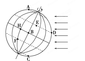 (3)根据晨线与赤道的交点是地方时12点,那么此点所在的经线上地方时都是6点,图中所示是半球,经度差相差180°,分成六分,每相邻的经线经度相差30°,相差两个小时,计算可知C、D为12时,F、H为4时,比B晚2小时。