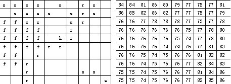 2、单选题 左图为某区域的地理信息空间数据地图,每个小方格表示实际长宽各10米,图中r表示河流,s表示林木,h表示住房,f表示耕地,右图中数据表示相应区域内各方格的平均海拔高度(单位:米),回答1~2题: