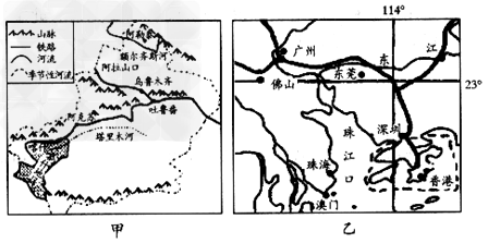1、单选题 2010年5月,喀什经济特区成立;2010年8月26日,深圳经济特区成立三十周年。读甲、乙两地区示意图,回答1—2题。