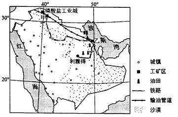 (1)读图,沙特阿拉伯靠近亚洲、非洲、欧洲市场,濒临海洋,产品运输方便。该地磷酸盐矿品位高,储量大,易开采。油气资源丰富,能源成本低,资金雄厚。有利于工业发展。