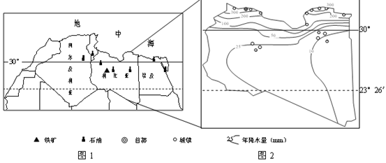 材料三:图1是利比亚及周边地区示意图,图2是利比亚城镇和年降水量分布示意图。