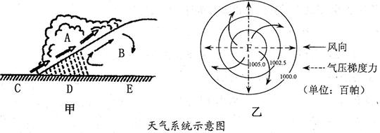 (2)根据图示:图中乙越往中心气压越高,所以乙图中F处是高气压中心,根据气流顺时针从中心向四周辐散,所以位于北半球,高压控制,天气晴。