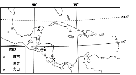 材料一 下图是中美洲局部地区示意图;下表为图中A、B、C三地的降水资料(降水量:mm)。