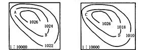 5、单选题 所给的两幅等压线分布图中,A、B、C、D四处风力最大的是