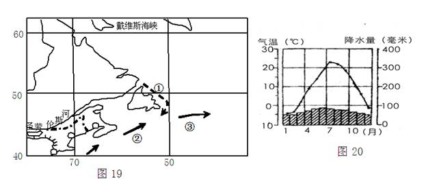 (2)(4分)根据图19中信息,洋流①、②、③中,属典型风海流的是??,其名称是?;图20是芝加哥市的气候资料,根据气温、降水的特点,判断其类型是?;该气候对应的自然带是 ?。