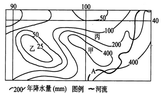 (1)图中等降水量线数值递变的趋势,可以反映出我国年降水量的空间分布具有__________________________________________ 的分布规律。甲地的降水量__________(大于或小于)400 mm。(2分)