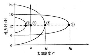 4、单选题 图中①②③④四条线分别表示北半球夏半年某日四地太阳高度变化,h为已知量,回答下列问题:(6分)
