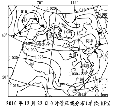 5、填空题 下图为“2010年12月22日0时海平面等压线分布图”,读图回答下列各小题。(共6分,每空1分)