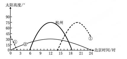 (1)杭州约为5:30日出、18:30日落,昼长约为13小时,说明此日不是二分日;从图中可以看出,①地该日于北京时间14点日出、2点日落,昼长为12小时,即昼夜等长,说明该地位于赤道上。该地太阳高度最大时当地地方时为12:00,此时北京时间为20:00,可以计算出该地经度为0°。