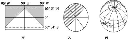 (3)此时为2010年12月22日,是北半球冬至日,甲图中北极圈内出现极夜现象,为冬至日;乙图中昼夜平分,为二分日;丙图中北极圈内出现极昼现象,为夏至日。因此三图能表示此日昼夜分布状况的是甲图。此日太阳直射南回归线,全球正午太阳高度自南回归线向南北两侧递减。