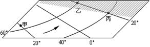 若此刻丙地地方时是17:30,同时正好有一架飞机从乙地取最短路径飞往甲地,行程用了2小时30分钟,则下列说法正确的是
