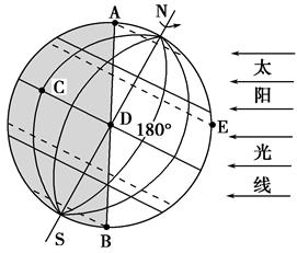 (1)太阳直射点的地方时为12点,即为昼半球的中央经线,根据图中经度和东经的变化规律,直射点经度为150°E(顺地球自转方向,越来越大为东经,反之为西经,图中相邻两条经线相差60°),故直射点E为(23°26′N,120°W),正午太阳高度角为90°。晨昏线的判断,晨昏线判断,顺地球自转方向,由白昼过渡到黑夜为昏线;由黑夜过度到白昼为晨线。故AB为晨线。