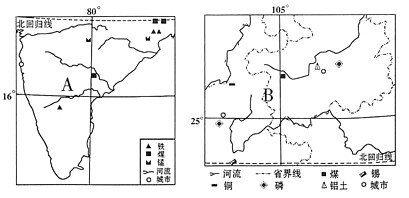 本题解析:通过对海陆轮廓的辨认和对经纬网的判断分析,可以得出A、B两大高原分别为德干高原和云贵高原。德干高原,西部略高、东部略低,是起伏和缓的古老低平高原;云贵高原主要包括云南东部和贵州大部,地势西高东低,平均海拔从2000米下降到1000米,高原上峰岭众多,地面崎岖。?