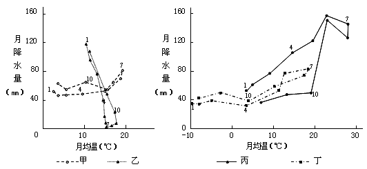3、单选题 图为甲、乙、丙、丁四地的气候资料,图中各点代表月均温和月降水量。回答下列问题。