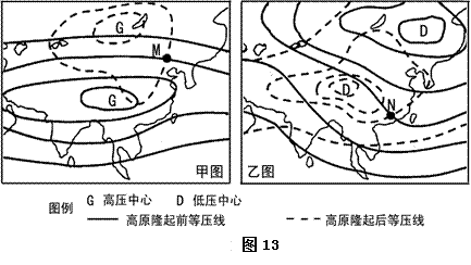 本题解析:(1)1月份大陆形成了高压中心,海洋形成了低压中心,所以甲图为冬季(2)N地所在的图为夏季图,在高原隆起前,通过等压线图画一下风向看为西南风,隆起之后,同样画一下等压线,可以发现为东南风(3)隆起之后M地受高压中心影响大,所以气温会降低,降水会减少(4)高原隆升后,并向东挤压;高原边缘地壳比较活跃,多断层;汶川地震位于高原东缘的一个断裂带上;使能量不断积累,汶川剧烈释放