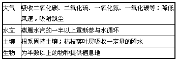 参考答案:增加碳储量,净化空气,防风固沙,调节气候,增加降水,涵养水源,保持水土,保护生物多样性。