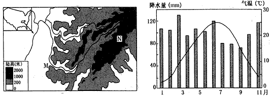 5、综合题 左图是某国局部地形图,右图是N地的气候资料图,读后回答下列问题。