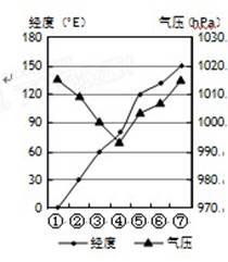 3、单选题 下图为北纬31°纬线上7个地点某月的平均气压分布图。