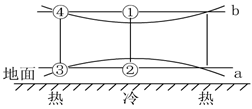2.热力环流的基本原理:热空气上升,冷空气下沉,进而形成环流,故①、②、③、④四点的空气运动为:③→④→①→②→③。