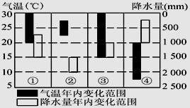 【小题1】①地全年高温,年降水量约为1000mm,为热带草原气候;②地全年高温,降水量在1500——2000mm之间,为热带季风气候;③地全年高温(气温年较差稍大),降水量在1000——2000mm之间,为热带季风气候;④地冬夏气温差别小,降水量在500mm左右,为温带海洋气候。