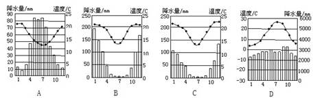【小题1】。广州的气候类型为亚热带季风气候,所以D正确。四图均为北半球,A为地中海气候;B为温带季风气候,C为热带沙漠气候类型。