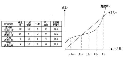 4、单选题 下表某区域在一定时期内影响企业成本上涨因素统计表,下图为某企业成本与产量变化曲线图(利润=总收入-总成本)。据此回答下列各题。