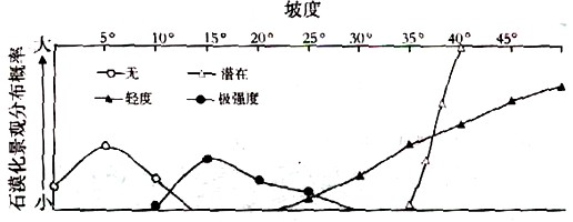 (2)潜在石漠化一般出现在地形坡度___________以上地区。然而,实际上无石漠化现象最可能出现在坡度_____________以下地区;严重石漠化出现的坡度范围是___________________________。