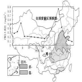 4、综合题 2013年冬春季节我国部分城市频繁出现雾霾天气。二氧化硫、氮氧化物和可吸入颗粒物是形成雾霾的主要物质。左图为“2013年1月29日全国雾霾区预报图”,下图为“北京市2012年12月28日PM2.5(细颗粒物)浓度走势图”。读图回答下列各题。(14分)