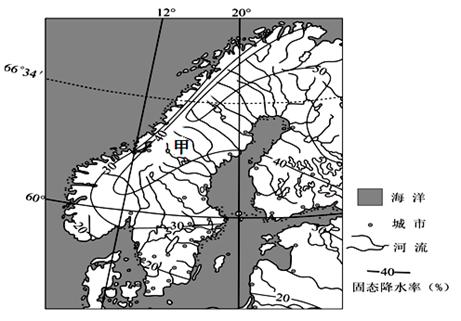 固态降水率是指固态降水(雪、雹等)量占全年降水总量的百分比。下图示意甲半岛及周边地区等固态降水率线分布。