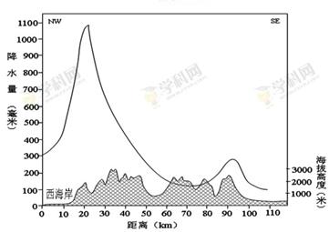 5、单选题 下图为某岛屿的西北-东南向的地形剖面以及年降水量分布图,岛屿东西海岸相距平均约140公里左右。读图回答下列各题。